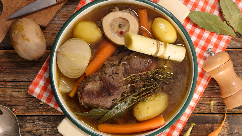 Fans of classic French cuisine have no doubt heard of pot-au-feu, and perhaps you've even enjoyed the comforting, savory dish for yourself. Translating from French to aptly mean "pot on fire," pot-au-feu looks a lot like a classic beef stew in that it features broth, vegetables, and of course, some type of beef. In this case, often multiple cuts. While the type of beef you opt to use comes down to personal taste, good options include brisket, chuck roast, or oxtail — all cuts that benefit from a low and slow cooking method.