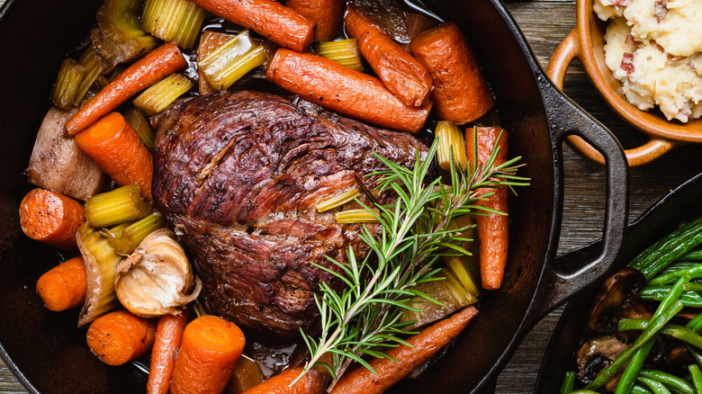 There's a lot to love about pot roast, and one of the biggest perks is that it's an all-in-one dish. There are quite a few vegetables that you could include in a pot roast, with some common players including onions, carrots, and potatoes. When you prepare the roast, you don't need to worry about preparing sides — they're built into the dish!
