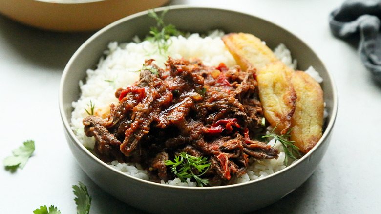 Though ropa vieja is considered a classic Cuban dish through and through, it does technically have roots in Spain. And, anyone familiar with Spanish might recognize ropa vieja to translate to "old clothes," which is quite the apt name for a dish that features a heaping pile of shredded beef.