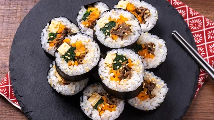 If you're unfamiliar, kimbap (also commonly written as gimbap) is a Korean dish that resembles sushi and consists of rice, seaweed, and various fillings. While both kimbap and sushi can generally be defined as rice rolls with various ingredients inside, the two are distinct from one another in key ways. For example, sushi typically includes raw seafood, while kimbap usually contains cooked ingredients. Another important difference is in the seasoning. Sushi is seasoned with sushi vinegar, while kimbap is seasoned with sesame oil.