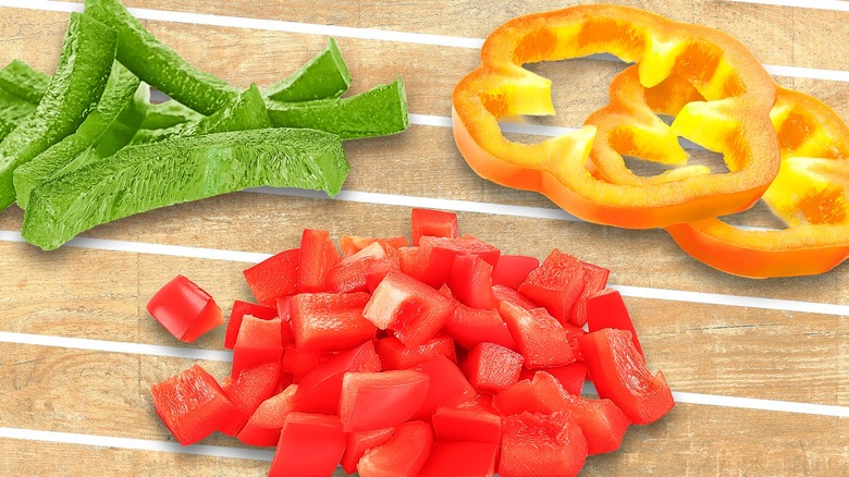 Bell peppers are a versatile fruit (that's right — not a vegetable) that are delicious in a variety of dishes from an omelet to stir fry. The crunchy and colorful vegetables add both flavor and texture to any dish they're added to. They also have a lot of health benefits, because they're high in nutrients like vitamin C, vitamin K, and potassium. Bell peppers come in different colors like green, red, yellow, or orange, but no matter what variety, it's important to know how to cut them to match the recipe.