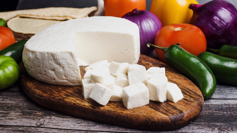 Made from cow's milk, or a combo of goat's and cow's milk, queso fresco – which literally translates as fresh cheese – is mild, soft, and slightly salty, becoming an excellent topping in countless Mexican dishes. According to Mexico's CONAHCYT (National Humanities, Science, and Technology Council), the country produced almost 100,000 tons of queso fresco in 2021. It's easy to find queso fresco at most local grocery stores, as is finding queso panela, another excellent choice for your cheesy needs. Panela is made from skimmed cow's milk and also boasts a fresh, milky flavor. Neither queso fresco or panela will melt, and they both crumble easily, becoming the perfect topping when your dish needs a touch of savory, creamy goodness.
