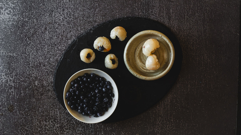 - To make the eyeballs, insert a blueberry in each drained litchi. Drop the litchi eyeballs into the pitcher.