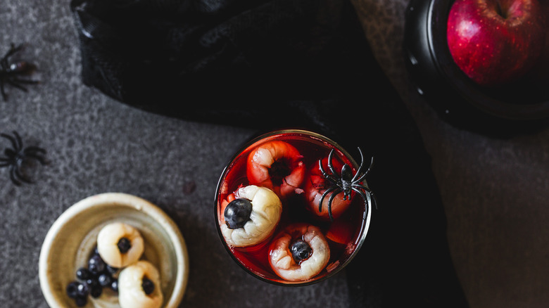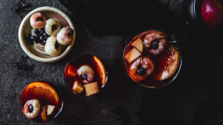 According to Ksenia Prints of At the Immigrant's Table, this recipe is a crowd-pleaser that combines the rich flavors of dark red wine with the fruity sweetness of Italian soda and vermouth. The addition of blackberries, black grapes, and blueberries, along with eyeballs made from litchis and blueberries, make this sangria perfect for any Halloween gathering. And the best part is, a pitcher (or cauldron) of this brew is easy to make in just 15 minutes, making sure you're ready to host a witches' coven in no time.