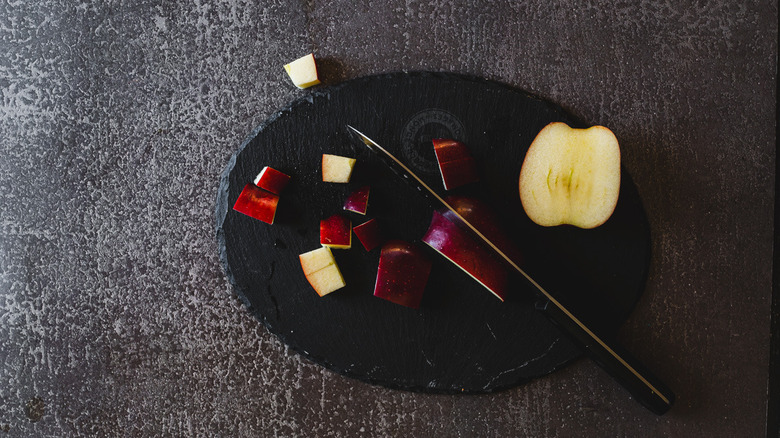 - Cut the apple into cubes. Slice the orange into thin rounds.