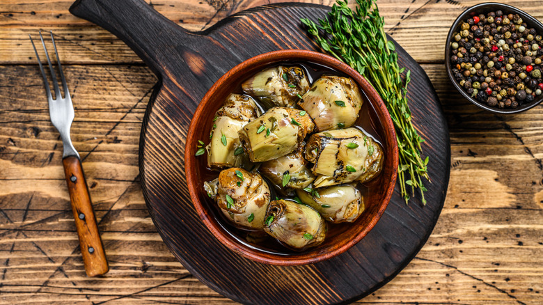 You can do a million things with a tin of the stuff. Throw them onto or under a grill with some butter, then serve like you would sliced meats. Soak them in a punchy, herbaceous marinade — such as the juices from a jar of sun-dried tomatoes — to add balance to a charcuterie board filled with rich cheeses and meats. You can also blend canned artichokes with a hunk of cream cheese and a hint of acidity to turn them into a tasty dip for crudités. Are you looking to add a bit more crunch to your charcuterie board? Throw a tin of drained and well-seasoned artichokes into the air fryer for a crispy, almost caramelized treat guaranteed to please a crowd, especially when dunked into a creamy dipping sauce.