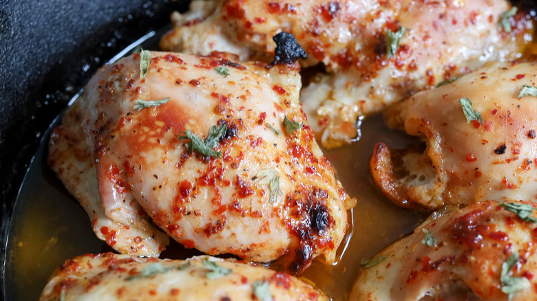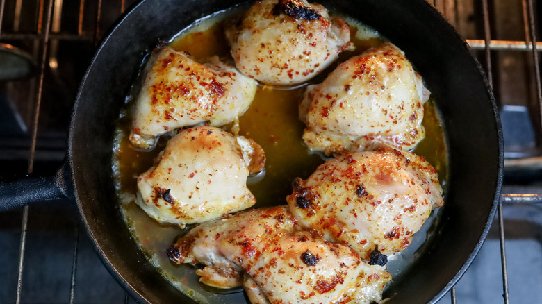 Arrange the chicken thighs in a single layer in a cast iron skillet or baking pan. Pour any remaining marinade on top of the chicken pieces.