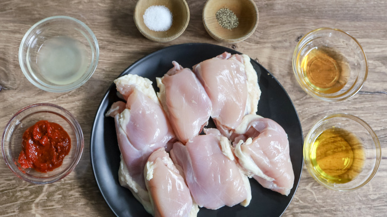 - Add the chicken thighs to a large bowl. Pour the harissa mixture over the chicken, coating the pieces. Refrigerate for 30 minutes.