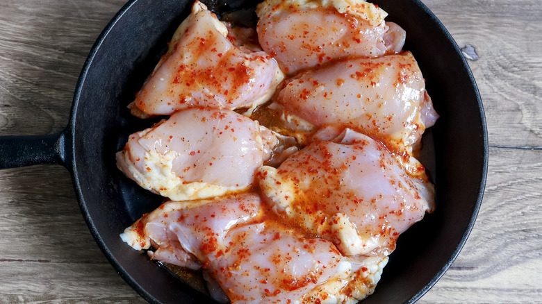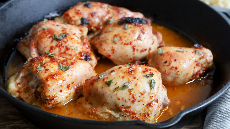 - Arrange the chicken thighs in a single layer in a cast iron skillet or baking pan. Pour any remaining marinade on top of the chicken pieces.