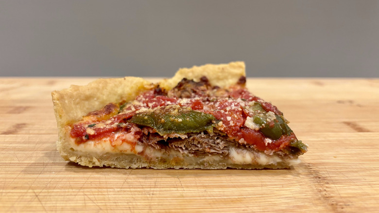 As for the flavors, they come together impeccably. While melding Italian beef with pizza toppings might sound ambitious or even odd to some, the reality is anything but. It's deliciously cohesive and doesn't taste out of place in the slightest. Giardiniera is one of our favorite pizza toppings, so to see it included on a pizza is a welcome addition. When pitted against the sweet peppers version, we leaned decisively towards the giardiniera, despite its robust spiciness. It's not overwhelming; just keep some water on hand.