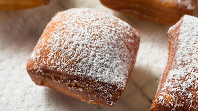 Another telltale sign is whether your sweet pastry is loaded with fillings, flavors, icings, or toppings. Beignets are not glazed or coated in icing, nor are they typically filled with creams or jams (though they are occasionally accompanied by a sweet sauce). It's rare that you'd ever walk into a classic American donut shop and find square-shaped pastries in the display cases. If you're looking for a square, powdered sugar-coated beignet, you'll need to leave the donut shop and seek out a French bakery.