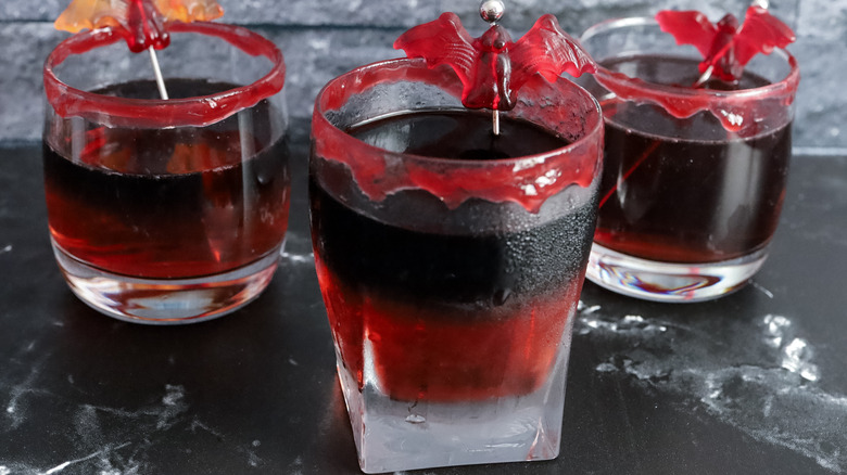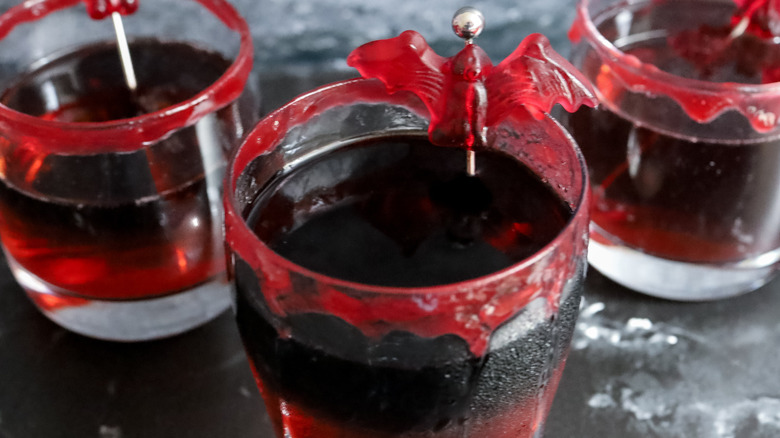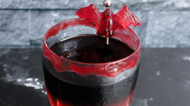 The raspberry jam around the rim of the glass can work as a garnish itself, but there are lots of ways to add an extra touch to this drink. "I got these cute vampire bat gummies from a Halloween store and that's what I used to garnish them. I also saw gummy vampire fangs that could be fun," says Morone. So certainly, you can head to your local Halloween store or browse the Halloween section of your grocery store to see what fun garnish options you can find.