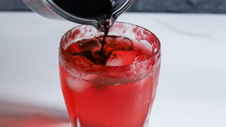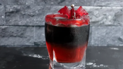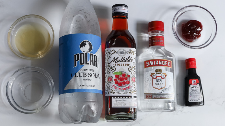 To make a single cocktail, you'll need raspberry jam, lemon juice, vodka, raspberry liqueur, club soda, and black food coloring. Just remember that the 2 ounces of vodka need to be separated to make the distinct black and red layers of the cocktail.