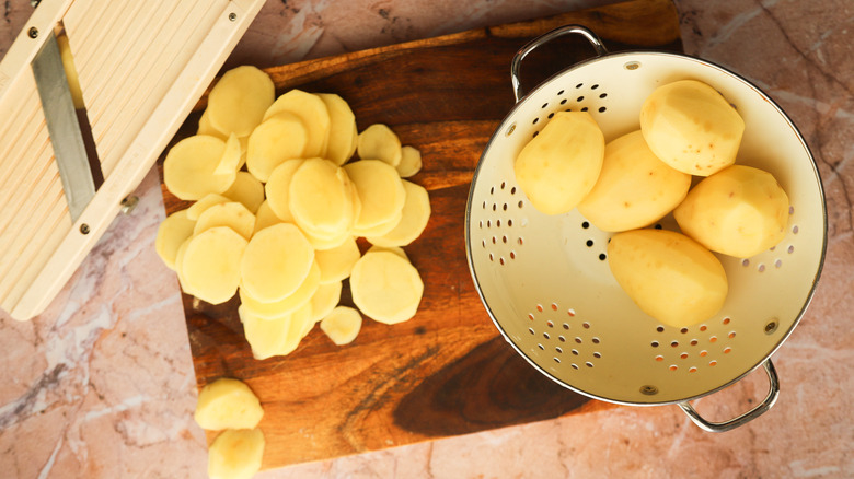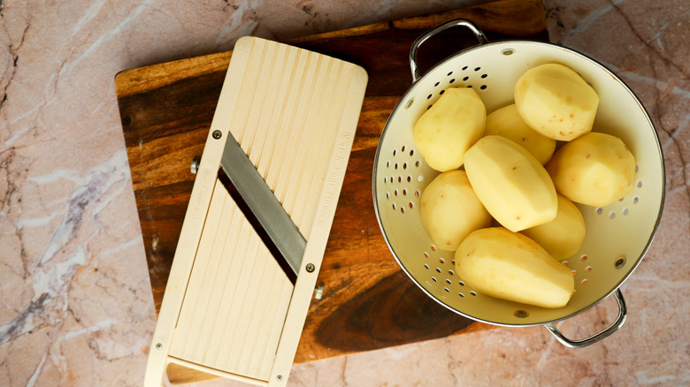 - Wash and peel the Yukon potatoes. Using a mandoline or a sharp knife, thinly slice the potatoes to about ⅛-inch thickness. Set aside.