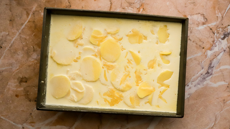 One of the best things about scalloped potatoes is the simplicity of the ingredients. Start with a few pounds of Yukon gold potatoes. "This variety is really the best choice for this dish. Russet potatoes can tend to get grainy while Yukon golds maintain a smooth texture," says Murray. The base of the dish is made with a mixture of milk and cream, flavored with garlic, thyme, salt, pepper, and a hint of nutmeg. The final ingredient is the Gruyere cheese. You can buy this pre-grated, but buying a block of it and grating it yourself may save you money and taste better.