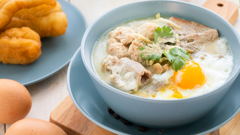 Due to congee's therapeutic affiliation, the dish also frequently integrates medicinal ingredients. Fuzhou-born Laba congee, which is traditionally enjoyed according to the lunar calendar, employs whole grains, nuts, and dried fruit. Congee in Yunnan is crafted with black rice and Job's tear, a grain full of calcium, iron, zinc, protein, and antioxidants (via Science Direct). Such malleability is a cornerstone quality of the dish — a variance that extends abroad, too.