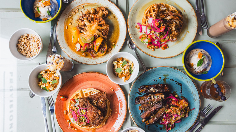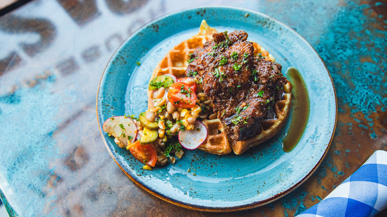 We take pride in making sure that vegetarian food doesn't feel secondary, that it makes a lot of sense and it's really delicious. Making vegan waffles and then treating the mushrooms almost like a chicken, so it's a play on chicken and waffles. It works well together. Putting peanut into the waffle gives you a whole other texture too, that makes the waffle both crispier but also creamier in a way.