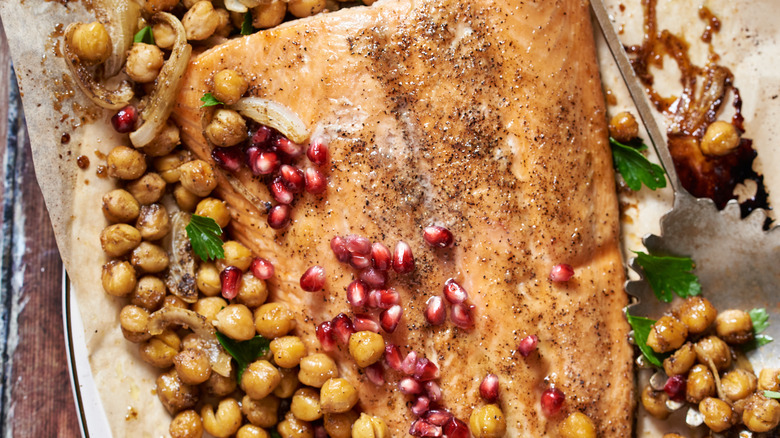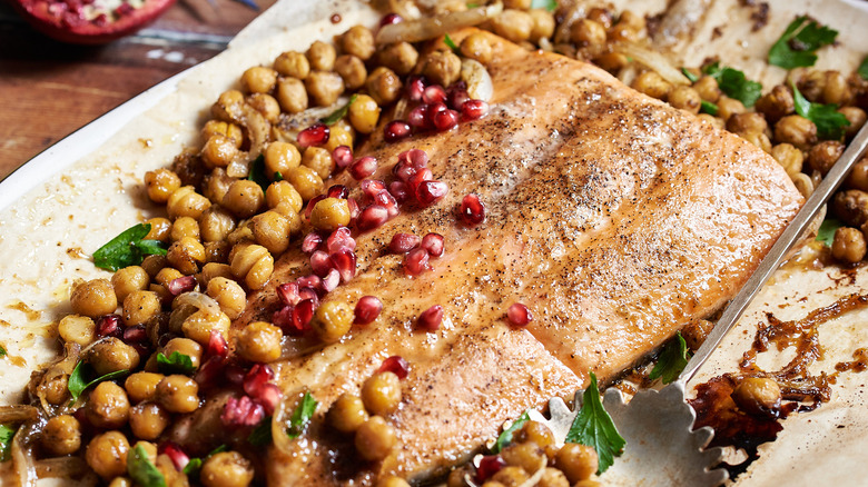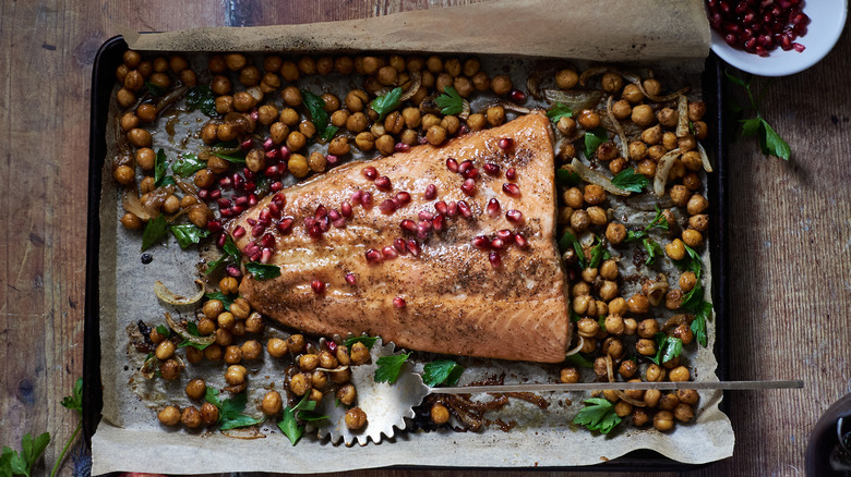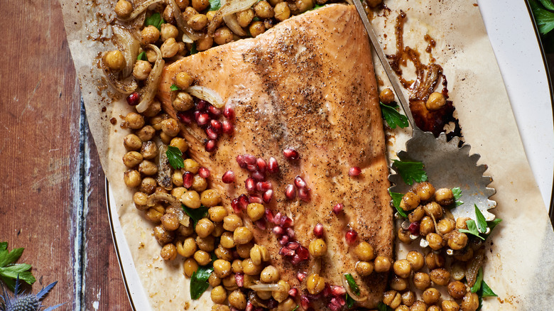 This Middle Eastern-inspired take on salmon glazes the fish with pomegranate molasses then roasts it with cumin-spiced chickpeas.