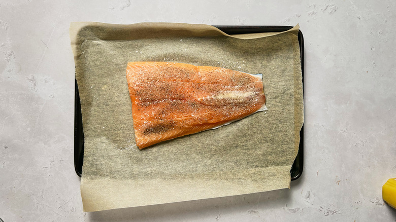 - Season the salmon with 1 teaspoon each salt and pepper.