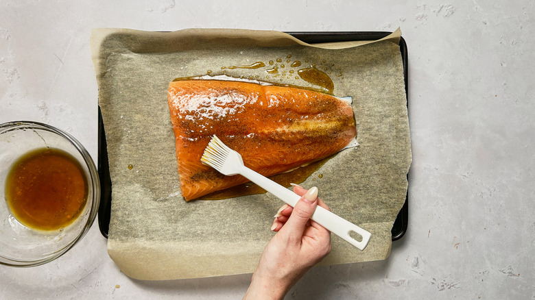 - Brush the honey mixture onto the salmon, coating completely. Arrange on the baking sheet.