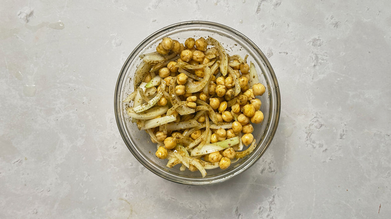 - In a bowl, toss the chickpeas with lemon juice, 2 tablespoons olive oil, cumin, remaining salt, remaining pepper, and onion.