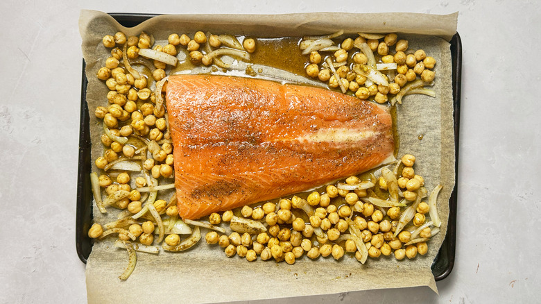 While salmon and chickpeas are perfectly fine for a full meal, there's also plenty of room for sides in this dish. You can pair the salmon with roasted carrots, sautéed Brussels sprouts, or steamed asparagus. You can also toss the chickpea and onion mixture with kale or spinach to make it a side salad. For more carbs, pair with roasted sweet potatoes or rice.
