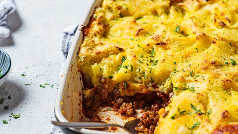 Shepherd's pie is traditionally made with minced lamb (that's the "shepherd" part), while cottage pie is the name of the same dish made with ground beef. What do you call a vegetarian pie made with lentils? "Beangrower's pie" just doesn't sound right, so you're welcome to call it a vegetarian shepherd's pie, or even a lentil pie. By any name, it's a delicious twist on the classic comfort-food casserole, topped with creamy mashed potatoes and baked until crusty on top.