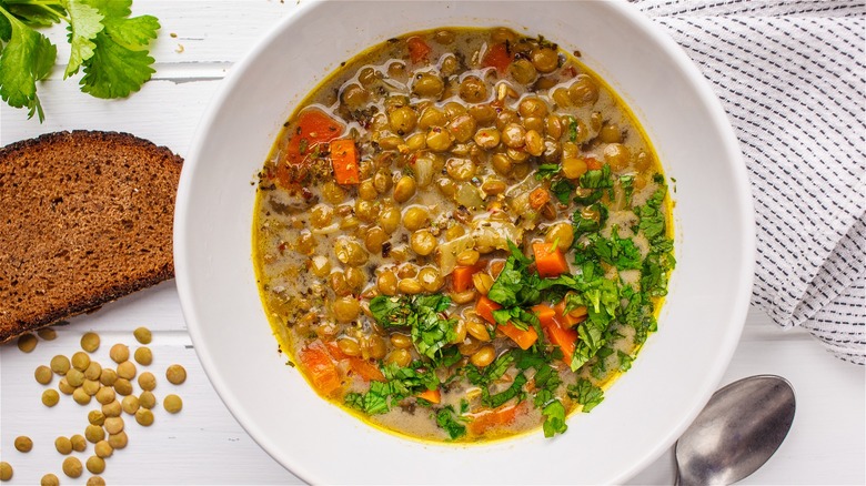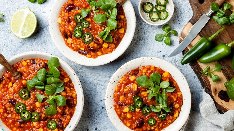 The same delicious attributes lentils bring to soup are relevant to chili, too. Lentil chili is a hearty twist on the southwestern favorite, and it's easy to make when you have canned lentils on hand. The beauty of lentil chili lies in the meaty texture that lentils bring, making for a thick and hearty base. Even if you prefer meat-based chili, adding lentils to your ground beef and tomatoes will enhance your dish, but if you're keeping it meat-free, the result will still seem meaty.
