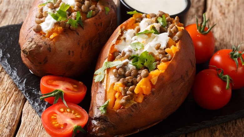 Sweet potatoes are one of the best ingredients of the fall, and their sweet, nutty flavor is the perfect pairing for savory lentils. You can roast your sweet potatoes for maximum texture enjoyment, simply steam them, or even microwave them on the fly. Once they're cooked, stuffing sweet potatoes with lentils makes them a complete meal, adding protein and substance. Canned lentils make things even more simple since all you have to do is heat them.