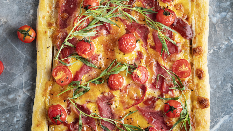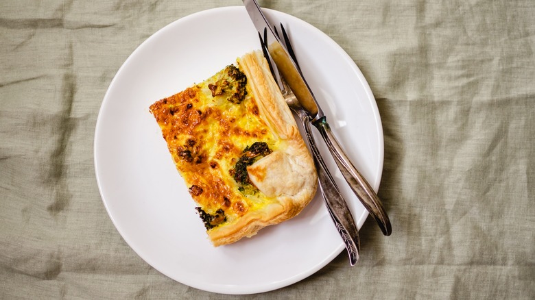 It's worth noting that if you prefer, you can still make your crust for sheet pan quiche from scratch — you would just roll it out to fit a baking sheet instead of a pie dish. But if ease and convenience are what you're going for, simply roll out store-bought puff pastry onto your sheet pan, making sure the edges cover the sides. If they're too small to fill the entire thing, you can place two pastry sheets next to each other and seal their edges together. And though it does take an extra step, you'll want to par-bake the crust first for maximum crispiness.