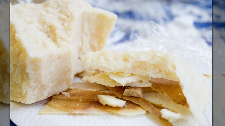 The easiest way to get parmesan rinds is to buy them at the grocery store. Not all grocery stores will have the rinds specifically on offer, but many do, especially those with dedicated cheesemongers. The alternative is to save the rinds of the parmesan cheese you already use at home. When storing leftover rinds, be sure to place them in an airtight container and stick them in the freezer so that they will stay in good condition until you are ready to use them.