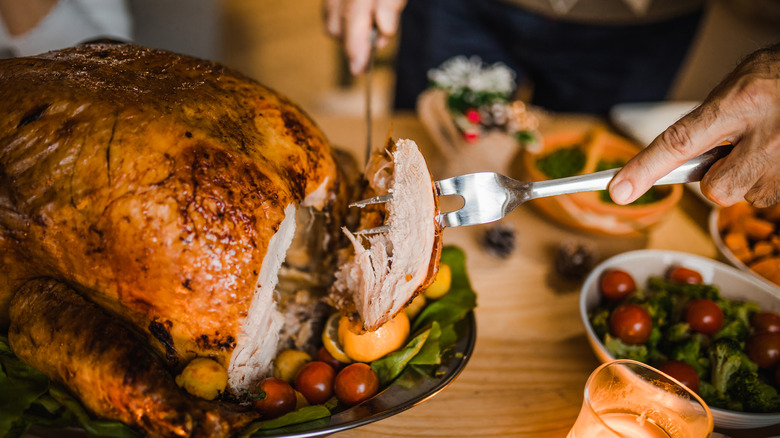 Though it makes a lovely centerpiece, the ritual of Thanksgiving turkey carving doesn't necessarily need to be done table-side. In fact, removing the performance of table-side turkey carving can also remove a significant amount of stress, which is always a good thing. To save yourself the worry and also save guests from having to choke down dinner that's either gone cold or, worse yet, dry, Ina has a genius solution. Make the turkey ahead of time.