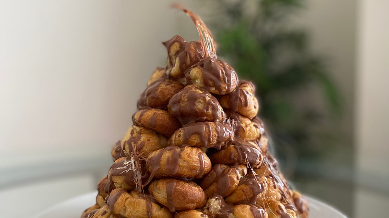 Profiteroles, though also round, tend to be slightly smaller (and daintier) as well as more uniform in size. They're designed to hold just the right amount of ice cream or other filling without becoming unwieldy. When served in desserts like the famed croquembouche, profiteroles are often piled high in an impressive tower held together by threads of caramel, sugary syrup, or chocolate.