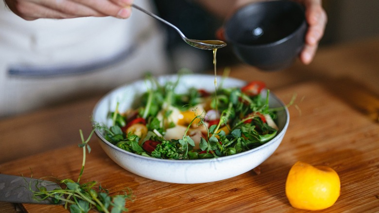 Worcestershire sauce is no stranger to salad dressings. It's a key ingredient in homemade Catalina dressing recipes as well as Russian dressing recipes. This condiment is a versatile tool in your kitchen with the capability of subtly elevating dressings whenever more flavor is desired. It's particularly useful as a quick flavor enhancer for simple homemade vinaigrette recipes. Because Worcestershire sauce already has vinegar in it, it's a natural pairing that will result in a more umami-rich salad dressing. But also add a dash of it to nearly any dressing that needs an ever-so-slight flavor boost.