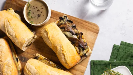 This vegetarian mushroom French dip sandwich, created by recipe developer Tanika Douglas, combines hearty portobello mushrooms with the sweet notes of caramelized onions, the salty creaminess of provolone cheese, and a rich, umami-packed shiitake jus. This sandwich elevates an everyday lunch or makes a delicious light dinner. Simple ingredients are crafted into a sandwich with punchy complementary flavors, ensuring it's as satisfying as it is easy to prepare. "Dip the portobello mushroom-laden baguette into the warm shiitake mushroom jus and prepare to be truly satisfied! The flavors work cohesively to create a warming, filling lunch or dinner," says Douglas.