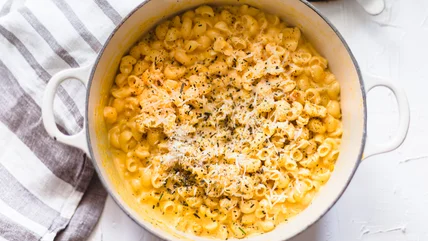 This sweet-and-savory dish may be impressive, but it's all about convenience. You can use fresh or frozen butternut squash, making this a staple dish year-round. Plus the leftovers hold up well in the fridge for reheating. To complete the meal, pair your butternut squash mac and cheese with roasted asparagus (double hit of veggies) and a medium-bodied wine like Cabernet Franc or Chardonnay. For a kid-approved dinner, try pairing this mac with dinosaur-shaped nuggets and steamed broccoli.