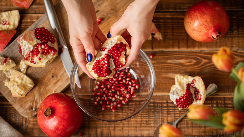 Try sprinkling pomegranate seeds over spreads of creamy goat cheese or ricotta, or look to match the fruit with mature blue cheese, soft Camembert, or melted brie. Not only can pomegranate seeds complement a variety of cheeses, but the bread and crackers you use will also bring out unique flavors in the ingredient combinations. Whether you're serving seeded crackers or sourdough bread with sliced or melted cheese, your basic plates of crostini are in for a serious upgrade.