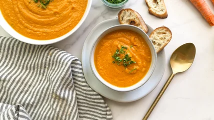 Vegan soup that's actually creamy? Thanks to the clever use of cashews, this carrot soup is a creamy delight while maintaining a vegan profile.