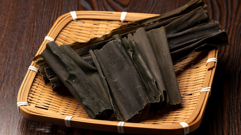 If you've ever made your own miso soup or the dashi base, you'll be well acquainted with kombu. Japan is surrounded by water, and because of this, Japanese food makes use of not only seafood and shellfish but also many kinds of vegetation found in the ocean. Kombu is one of the longest-lasting and economical umami staples you should have in your pantry, too. Depending on where you live, you can often find it pickled or fresh, but, for the rest of us, a bag of the deep green, leathery seaweed will work just as well to add a bit of aquatic, umami punch to your sushi.