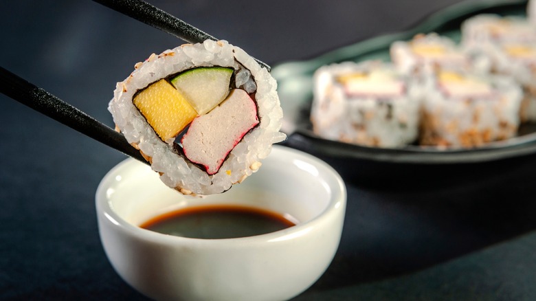 Mango sushi isn't often seen in Japan, but it does occasionally appear. Mangoes aren't as available or affordable as many other ingredients you'll often see in Japanese dishes, but the sweet fruit is still much loved. Using a slice of mango in a sushi roll adds sweetness, often making them better served at the end of the meal. However, mangoes also work incredibly well with anything spicy, so you'll often see that combination make an appearance, too. For vegetarian rolls, try mixing mango with carrots, avocado, or cucumber for a lovely, clean finish.