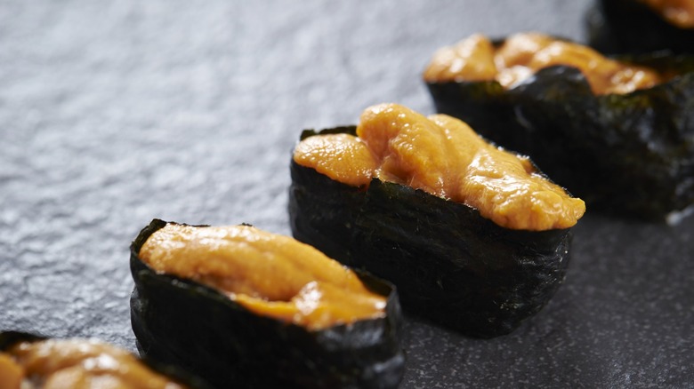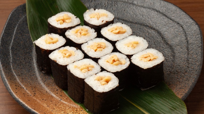 While you may have heard of sea urchin, have you ever had it in sushi? Known as uni, this little morsel is usually only used in two types of sushi — nigiri and gunkan. Nigiri, as you likely know, is a mound of rice topped with a slice of seafood and the occasional accompaniment like wasabi or ginger. Gunkan means battleship, and these sweet little rolls are unusual and spectacular. A mound of rice, like nigiri, with a wrapping of nori around the outer edge, gives these rolls a way to contain the upper toppings beautifully while calling to mind the naval ships that they were named for.