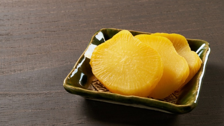 Pickled daikon most often gets its gorgeous hue from a pinch of turmeric. If you're buying it premade, look for versions that use natural coloring rather than artificial yellow, if possible. Sweet, salty, and with a crisp crunch, try pickled daikon in sushi that has softer ingredients like avocado or anything a little fatty, like tuna, tempura shrimp, or karaage chicken, for contrast.
