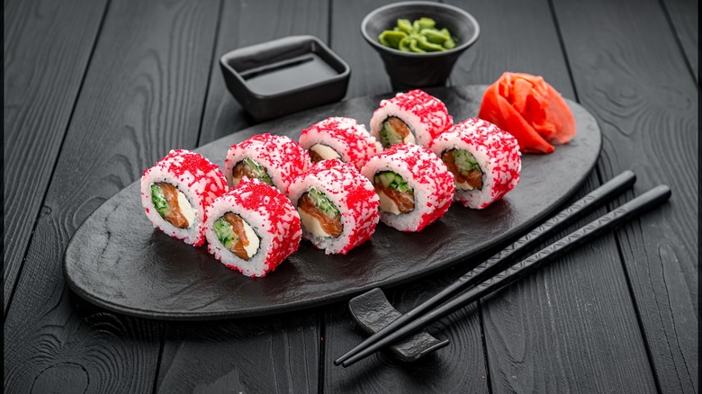 Another gorgeous way to add color and flavor to your sushi is roe, specifically flying fish roe. Known as tobiko, these delightful little balls come in a range of colors and flavors, which add another dimension to homemade sushi. You may have tried sushi with fish eggs in the past, possibly from smelt or sturgeon. If you enjoyed those, we urge you to search out tobiko, too. Tobiko has a very small size and fine texture, and it's known for its crisp pop when eaten, much like caviar. Unlike caviar, however, the minuscule size of the eggs (less than one millimeter) and the mild flavor make tobiko better suited to being used as a topping rather than eaten on its own.