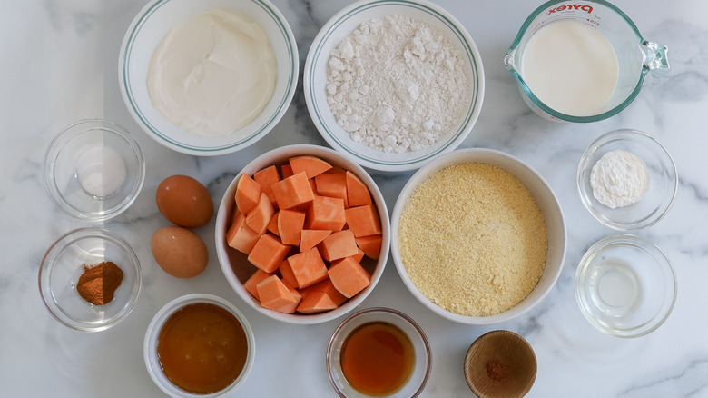In addition to sweet potatoes and honey, you're also going to need cornmeal, flour, baking powder, eggs, milk, sour cream, and salt to make this cornbread. For flavoring, you'll be using cinnamon as well as the aforementioned maple syrup and cayenne.