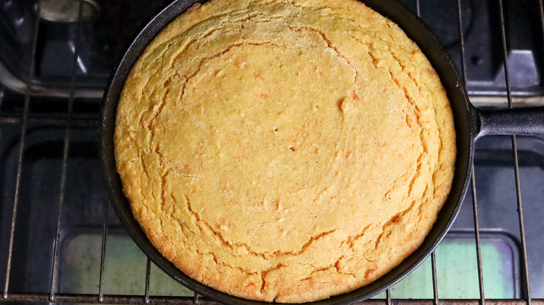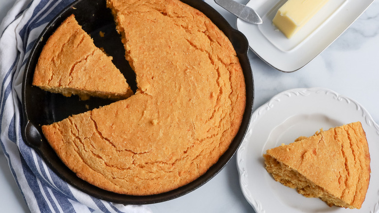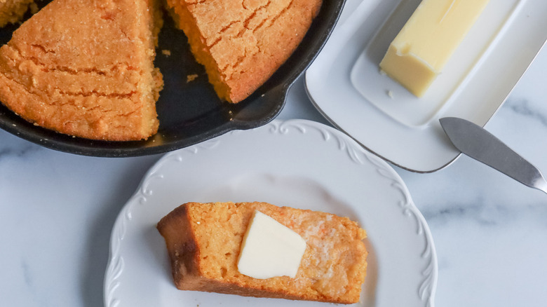 As this cornbread is sweet, it could also make for a nice breakfast treat to accompany a cup of tea or coffee. You can eat it plain but Morone suggests, "Spreading regular butter or making something like cinnamon or maple butter would also be really good on this." If you want to double down on the honey, here's a nutmeg, clove, and cinnamon-spiced honey butter recipe that would go well with this sweet potato cornbread.