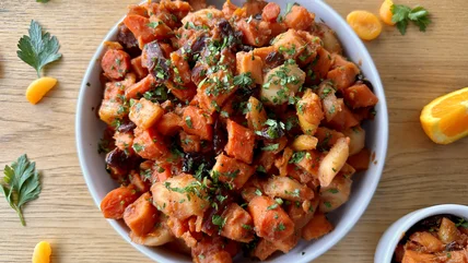 Classically, tzimmes is a complicated dish that's often saved for special occasions — Jewish holidays among them. "Stovetop versions of tzimmes, like this one, combat the idea of tzimmes being difficult to make," Rosenhouse says. "Sweet potatoes and carrots are cooked together in a little over 30 minutes, with balanced additions that make this dish a perfect complement to any weeknight meal, especially for cool, autumn nights."