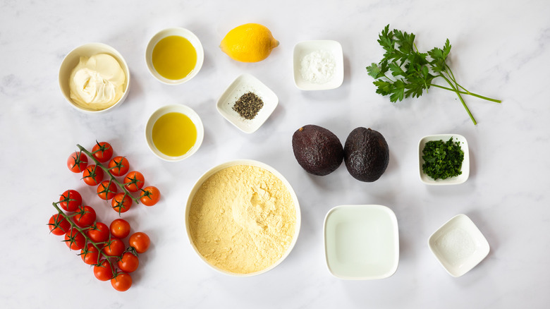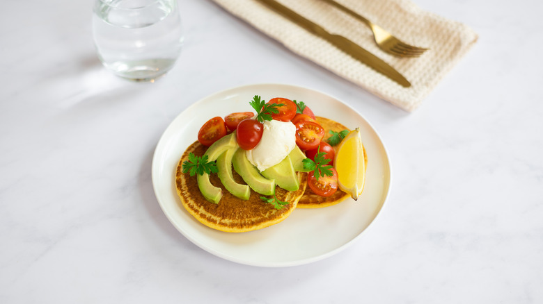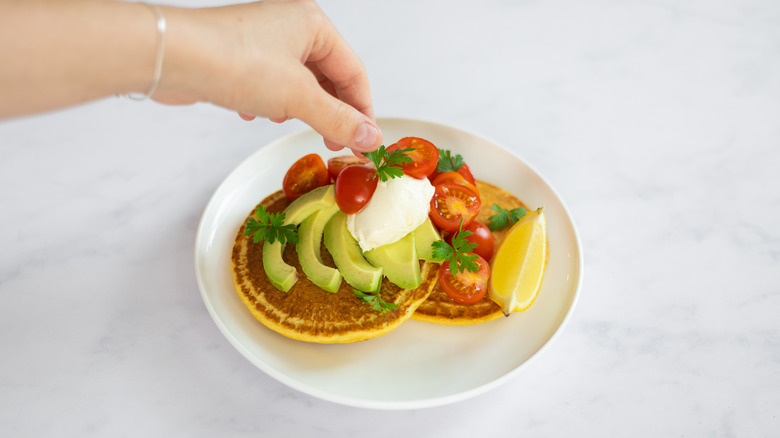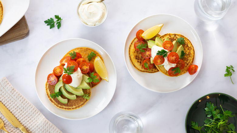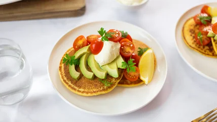 To whip up these savory chickpea pancakes, you will need chickpea flour, water, olive oil, chopped parsley, baking powder, salt and pepper. The ingredients are thoroughly mixed into a pancake batter ready to cook. The freshly cooked pancakes are then topped with avocado, fresh tomatoes, a generous spoonful of creamy creme fraiche, tangy lemon wedges, and fresh parsley. "Whilst this combination of ingredients is delicious, the toppings can be easily swapped out for your preferred alternatives such as scrambled eggs, sauteed spinach, or my personal favorite, golden, salty fried halloumi," says Douglas.