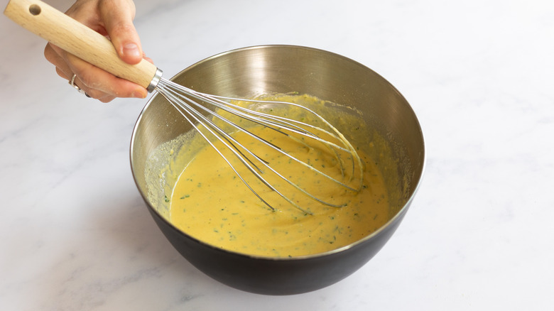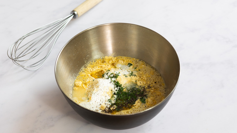 - Add the chickpea flour, water, olive oil, chopped parsley, baking powder, salt and pepper to a mixing bowl.
