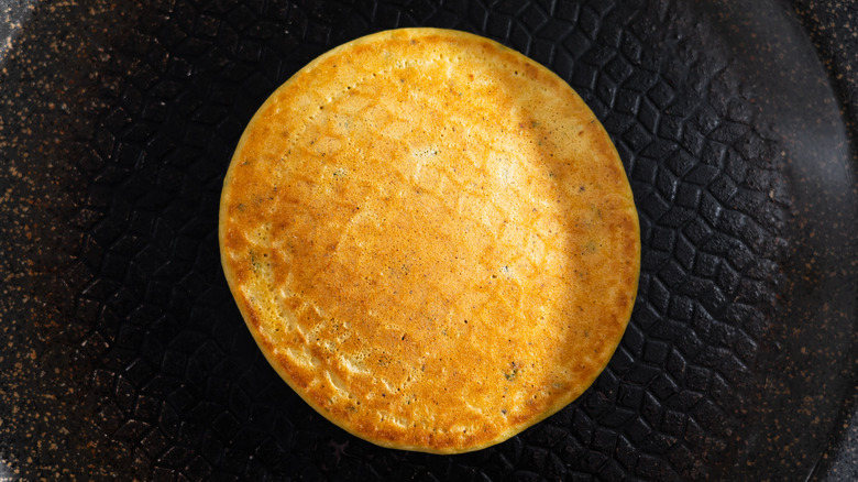 Cook the pancake until bubbly and golden underneath, then flip and cook the other side.