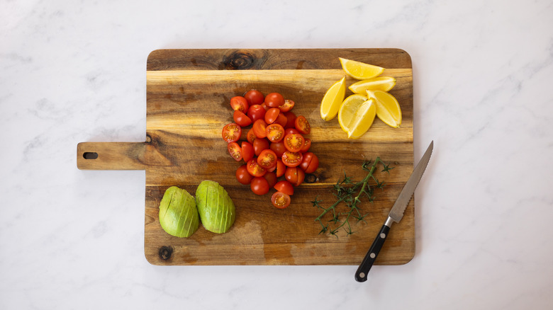 - Cut the avocados into the slices. Halve the tomatoes. Cut the lemon into wedges.